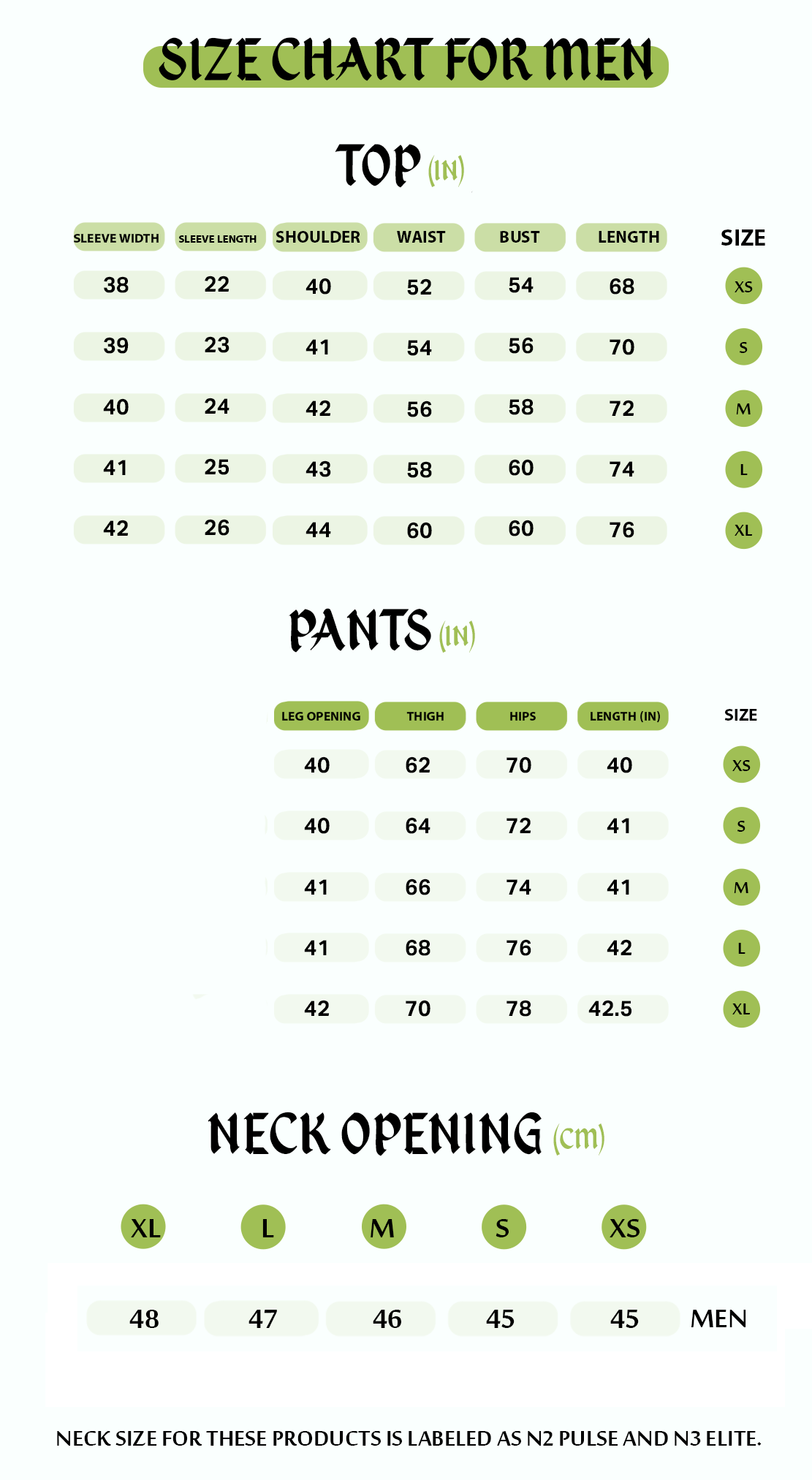 جدول المقاسات